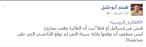 وقال -عبر منشور له على “فيس بوك”-: “فتش عن إسرائيل لو فعلًا ثبت أن الطائرة وقعت بصاروخ”.