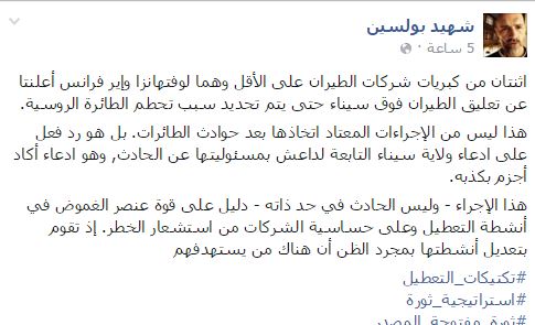وقال -عبر منشور له على “فيس بوك”-: “اثنتان من كبريات شركات الطيران على الأقل، وهما لوفتهانزا وإير فرانس، أعلنتا عن تعليق الطيران فوق سيناء حتى يتم تحديد سبب تحطم الطائرة الروسية”.