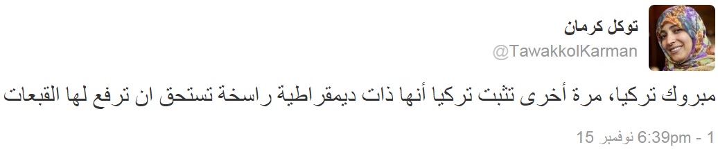 وصفت الناشطة والصحفية اليمنية والحائزة على جائزة نوبل للسلام توكل كرمان، فوز حزب العدالة والتنمية التركي في الانتخابات بنسبة 51%، بأنه إثبات لديمقراطية تركيا الراسخة.