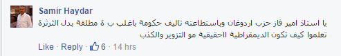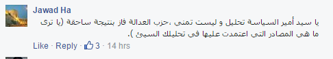ويقول جواد: “يا سيد أمير السياسة تحليل وليست تمني، حزب العدالة فاز بنتيجة ساحقة، يا ترى ما هي المصادر التي اعتمدت عليها في تحليلك السيئ؟”.