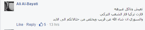 وقال علي البياتي: “تعيش وتاكل غيرها، فازت تركيا، فاز الشعب التركي، والسوري إن شاء الله عن قريب ويخلص من حثالاتكم إلى الأبد”.