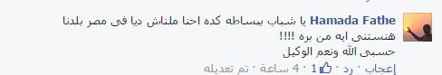 وعلق Hamada Fathe: “يا شباب ببساطة كده احنا ملناش دية في مصر بلدنا هنستنى إيه من بره!!!! حسبى الله ونعم الوكيل”.