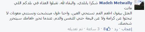 وعلق Madeh Metwally: “شكرا يا بلدي. والبقاء لله. تقبلوا العذاء في بلدكم اللي ماتت.. المثل بيقول اطعم الفم تستحي العين. واحنا طول مبنشحت ونستنى معونات لا تبحثوا عن كرامة ولا عن قيمة حتى للنفس والدم.. عندما تحرر طعامك سيتحرر شخصك”.