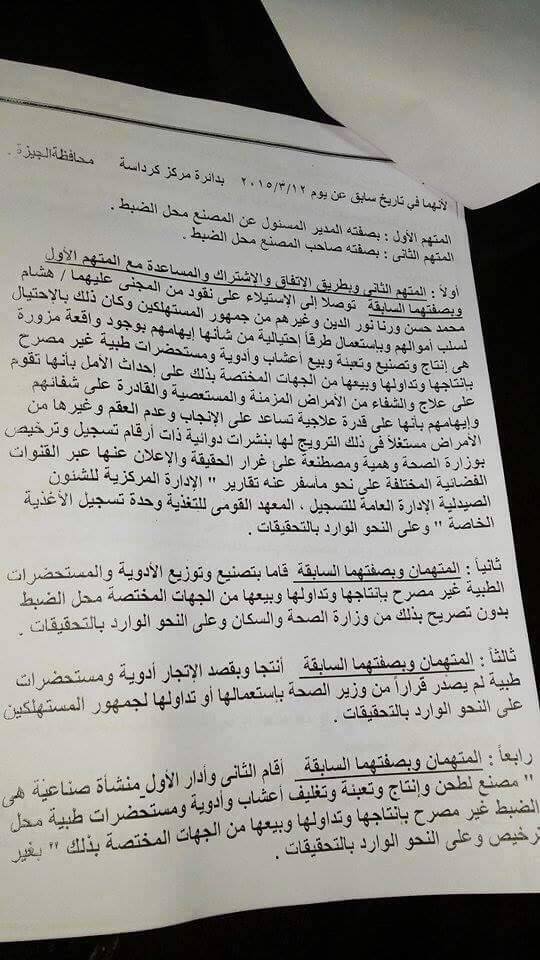 وبالاستناد للمادة 336 من قانون العقوبات، والمادتين 901، و902 من القانون المعدل رقم 273 لسنة 1960م، وقرار وزير الصحة رقم 76 لسنة 2000 بشأن الأدوية، بالإضافة إلى قرار جمهوري بشأن المنشآت الصناعية، وقانون الغش التجاري، وقانون السلع مجهولة المصدر؛ يُتهم كلٌّ من جمال زكريا فرج حفناوي، سعيد سعد حسانين، بإنتاج مستحضرات طبية لأعشاب مجهولة المصدر وهي فاسدة ودون جدوى، بحسب بلاغ جهاز حماية المستهلك.