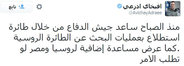 أخيرًا ساعدت إسرائيل مصر في البحث عن حطام الطائرة الروسية التي سقطت في محافظة سيناء، وجاء ذلك على لسان المتحدث بلسان جيش الاحتلال للاعلام العربي أفيخاي أدرعي، عبر تغريدة له على حسابه الشخصي على موقع التواصل الاجتماعي “توتير”.