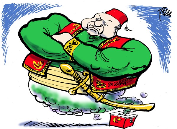 وصفت صحيفة الـ"نيويورك تايمز" الرئيس التركي رجب طيب أردوغان بالمارد الذي يظهر من الصندوق بدلا من الفانوس السحري، وجاء هذا الرسم بعد نجاح الحزب الحاكم في الانتخابات البرلمانية بتركيا
