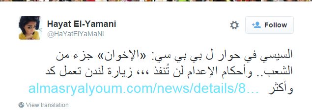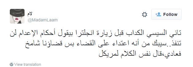 وقالت MadamLaam: “تاني السيسي الكداب قبل زيارة إنجلترا بيقول أحكام الإعدام لن تنفذ.. سيبك من إنه اعتداء على القضاء بس قضاؤنا شامخ فعادي، قال نفس الكلام لميركل”.
