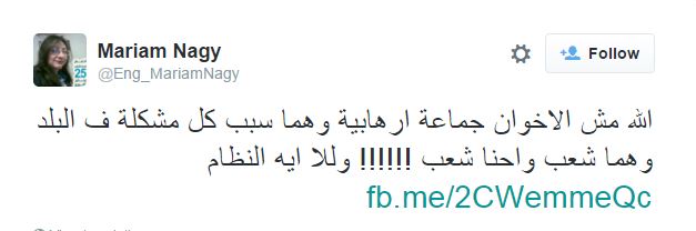 وأعربت مريم عن سخريتها قائلة: “الله مش الإخوان جماعة إرهابية وهما سبب كل مشكلة في البلد؟ وهما شعب واحنا شعب؟!!!!!! وللا إيه النظام؟”.