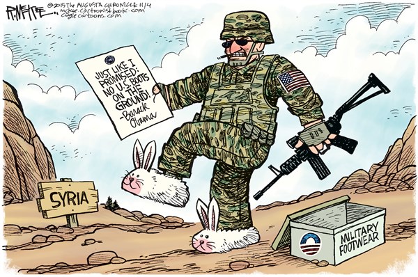 ونشر أيضا نفس الموقع هذا الرسم ساخرا من تصريحات أوباما: “لا الأحذية على الأرض في سوريا”: