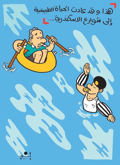أما في الشأن المحلي المصري وعن غرق الإسكندرية للمرة الثانية، فقد نشر موقع “المصري اليوم” هذا الرسم: