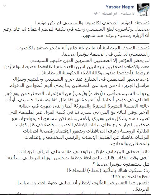 واشار- عبر منشور له على “فيس بوك”- ما نشرته الصحف البريطانية أن ما تم بثه على أنه مؤتمر صحفي لكاميرون والسيسي لم يكن في الحقيقة مؤتمرا صحفيا، مضيفا أنه لم يحضر المؤتمر إلا الصحفيين المصريين الذين جلبهم السيسي معه، بالإضافة لصحفيين بريطانيين اثنين بالعدد، تم انتقاءهما خصيصا، ولم يُدع غيرهما، (أحدهما مندوب وكالة الأنباء الحكومية البريطانية).