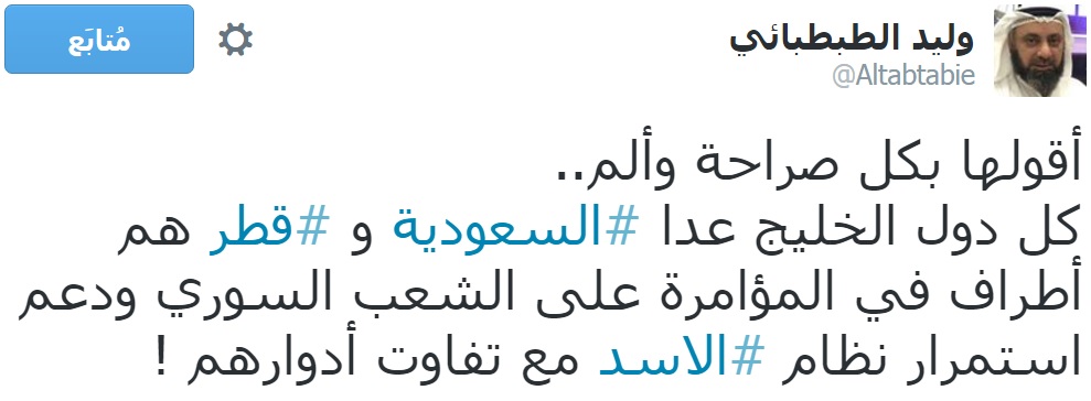 وقال “الطبطبائي”، في تغريدة له عبر حسابه الشخصي على موقع التواصل الاجتماعي “تويتر”: “أقولها بكل صراحة وألم: كل دول الخليج عدا السعودية وقطر هم أطراف في المؤامرة على الشعب السوري ودعم استمرار نظام الاسد مع تفاوت أدوارهم!”.