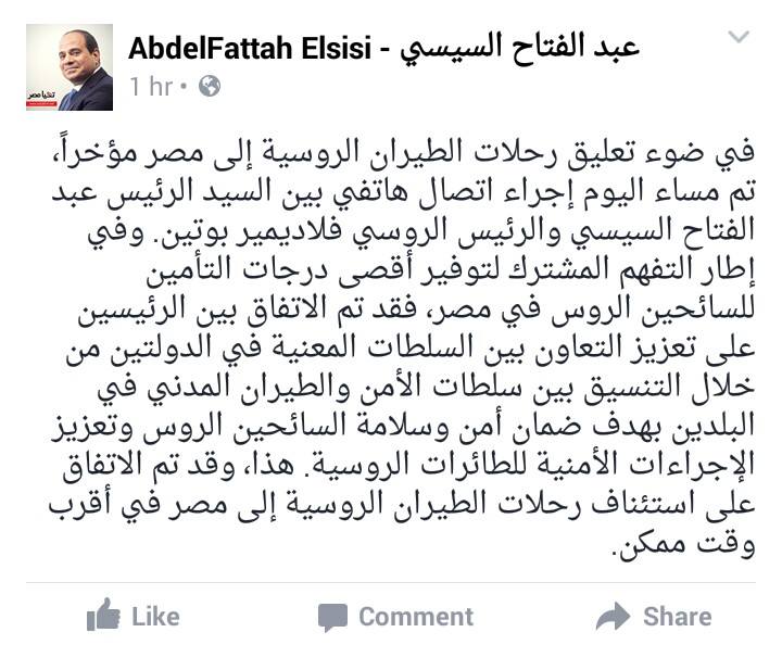 نشر الحساب الرسمي لعبدالفتاح السيسي، على موقع التواصل الإعلامي “فيس بوك” تصريحًا بشأن قرار بوتين بوقف الرحلات الروسية إلى مصر؛ نظرًا للظروف الأمنية.