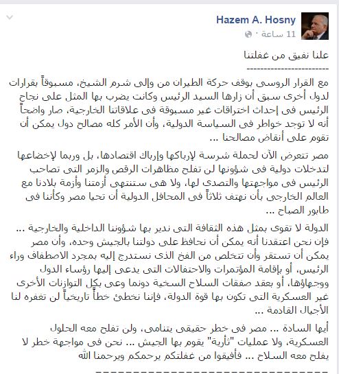 وأضاف “مع القرار الروسي بوقف حركة الطيران من وإلى شرم الشيخ، مسبوقًا بقرارات لدول أخرى سبق أن زارها السيد الرئيس -على حد وصفه- وكانت يضرب بها المثل على نجاح الرئيس في إحداث اختراقات غير مسبوقة في علاقاتنا الخارجية، صار واضحًا أنه لا توجد خواطر في السياسة الدولية، وأن الأمر كله مصالح دول يمكن أن تقوم على أنقاض مصالحنا”.
