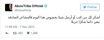 ووجه أبو تريكة رسالة إلى الجماهير من خلال موقع التواصل الاجتماعي “تويتر”، قائلاً: “أشكر كل من كتب أو أرسل شيئًا بخصوص هذا اليوم؛ فالمشاعر الصادقة تبقى دائما شكرًا جزيلاً”.