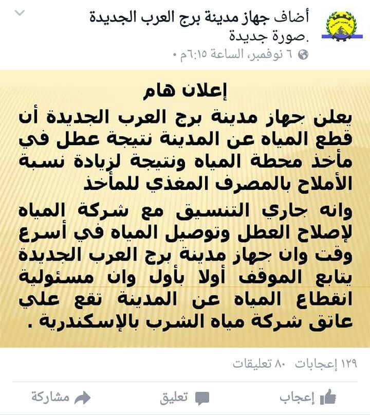 وحسبما أعلن جهاز مدينة برج العرب الجديد، فإن المياه انقطعت نتيجة عطل في إحدى محطات المياة لزيادة نسبة الأملاح واختلاطها بالصرف، مؤكدًا أنه جار التنسيق مع شركة المياه لإصلاح العطل.