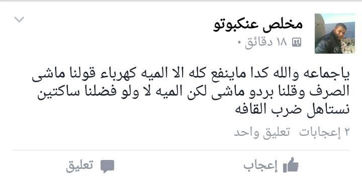 وأعرب مخلص عنكبوتو، عن استيائه قائلاً: “ياجماعة والله كدا ماينفع، كله إلا الميه، كهربا قولنا ماشي، الصرف وقلنا برده ماشي، لكن الميه لا ولو فضلنا ساكتين نستاهل ضرب القفا”.