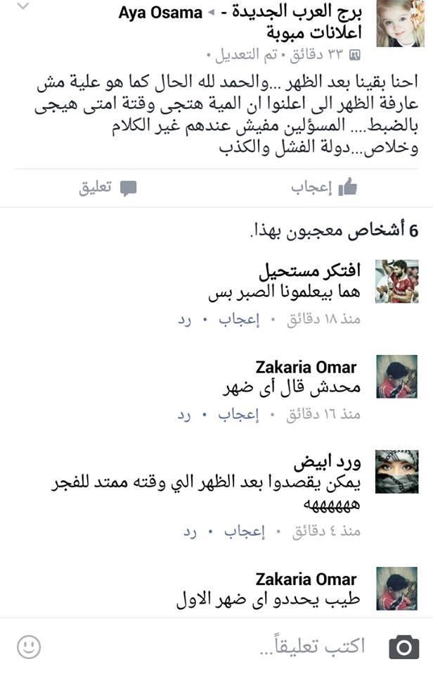 وعبر مجموعة على موقع التواصل الاجتماعي، باسم “برج العرب الجديدة”، نشر الكثيرون شكواهم، فقالت آية أسامة: “احنا بقينا بعد الظهر، والحمد لله الحال كما هو عليه، مش عارفة الظهر اللي أعلنوا إن الميه هتيجي وقته امتى هييجي بالظبط.. امسؤليين كفيش عندهم غير الكلام وخلاص.. دولة الفشل والكذب”.