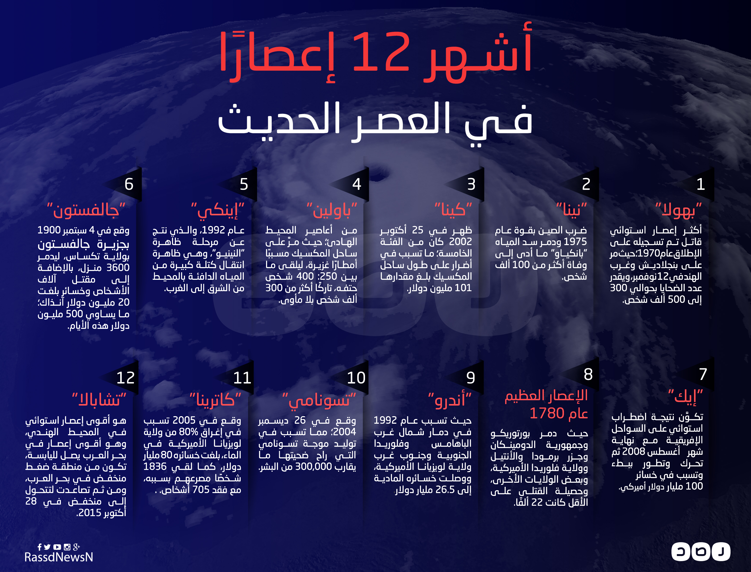ونستعرض لكم في هذا الإنفوجراف أشهر الأعاصير التي ضربت العالم في العصر الحديث: