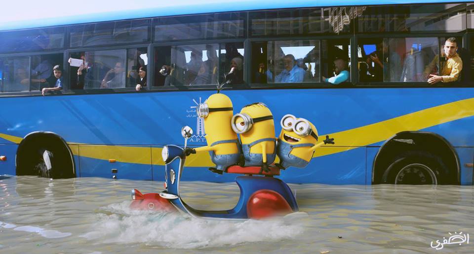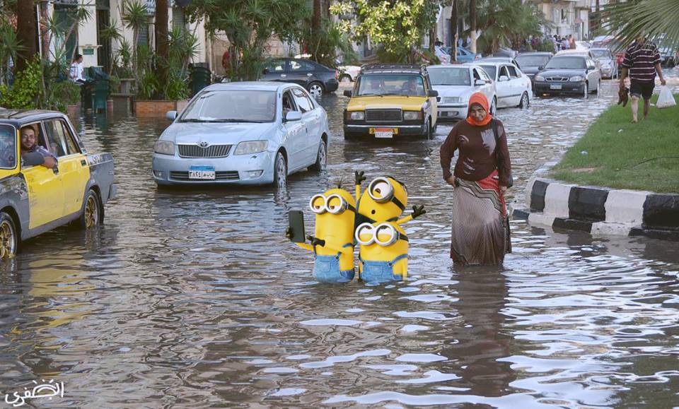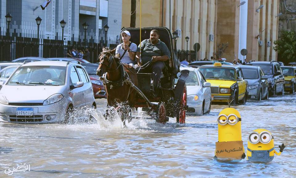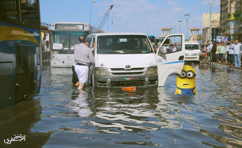عبد الله الجعفري، من محافظة الجيزة، مصور فوتوغرافي أنشأ ألبوم صور وأجرى تعديلات باستخدام برنامج “الفوتوشوب” تحت عنوان “أنقذوا المينيونز”، ليضفي تخيلًا ساخرًا جديدًا بوجود كائنات المينيونز الشهيرة في شوارع الإسكندرية الغارقة في مياه الأمطار.