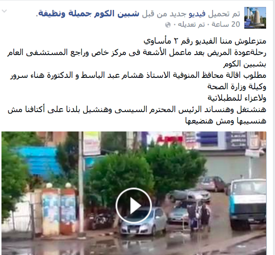 وكتبت الصفحة: تم نقل المريض بسبب تعطل جهاز الأشعة في المستشفى، مشيرة إلى أن فني الأشعة بالمستشفى استغل عطل جهاز الأشعة وفتح مركزًا ليستقبل مرضى المستشفى فيه”.
