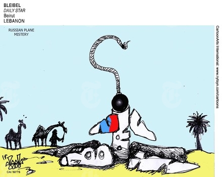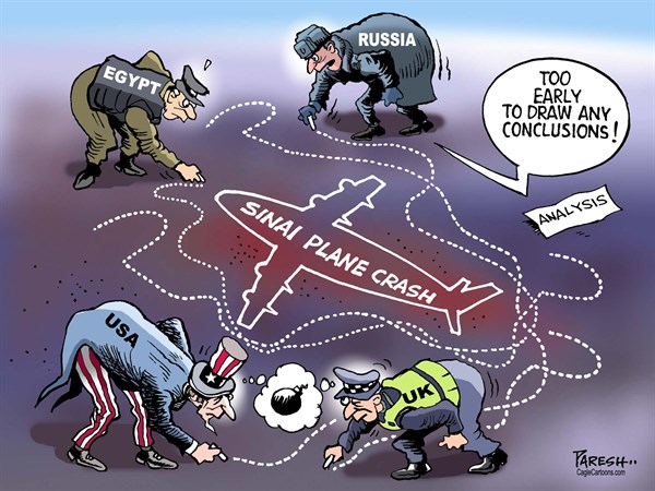 أما “بوليتيكال كارتونز” فعبر عن اعتقادات أميركا وبريطانيا في فك لغز سقوط الطائرة بعدما أشارتا إلى أن السبب هو انفجار عبوة ناسفة: