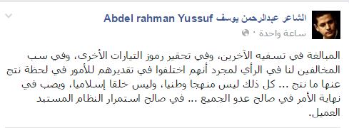 حذر الكاتب والشاعر عبدالرحمن يوسف، من تسفيه الآخرين المخالفين للرأي، وتحقير رموز التيارات الأخرى؛ لأنه في نهاية الأمر يصب في صالح النظام، المستبد، العميل، على حد قوله.