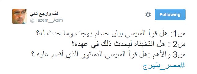 تساءل عبدالعظيم -عبر “تويتر”-: “هل قرأ السيسي بيان حسام بهجت وما حدث له؟”.. “هل انتخبناه ليحدث ذلك في عهده؟”..هل قرأ السيسي الدستور الذي أقسم عليه؟”.