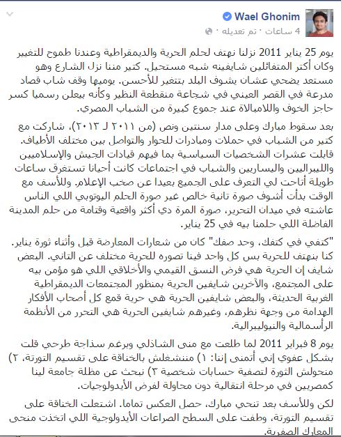 وقال “غنيم” في منشوره: “بعد سقوط مبارك وعلى مدار سنتين ونص (من 2011 لـ2013)، شاركت مع كتير من الشباب في حملات ومبادرات للحوار والتواصل بين مختلف الأطياف، قابلت عشرات الشخصيات السياسية، من الجيش والإسلاميين والليبراليين واليساريين والشباب في اجتماعات كانت أحيانا تستغرق ساعات طويلة أتاحت لي التعرف على الجميع بعيدا عن صخب الإعلام”.