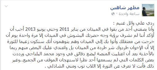 وأضاف شاهين: “إلا أن الإخوان طردوك شر طردة من الميدان، بل واعتدى عليك البعض منهم ربما بالأحذية بعد أن اعتليت المنصة لبضع دقائق في وجود محمد البلتاجي، ورددت بعض الكلمات التي لم يسمعها أحد، نظرا لاستهجان الموقف من الجميع، وغير ذلك فأنت لا تعرف عن الثورة إلا اللاب توب ومنى الشاذلي” .