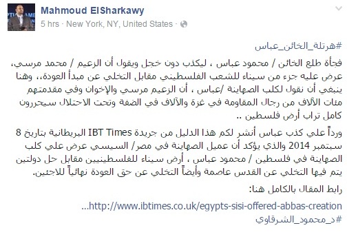 وأضاف الشرقاوي “وردًا على كذب عباس أنشر لكم هذا الدليل من جريدة IBT Times البريطانية بتاريخ 8 سبتمبر 2014 والذي يؤكد أن عميل الصهاينة في مصر السيسي عرض على  محمود عباس أرض سيناء للفلسطينيين مقابل حل دولتين يتم فيها التخلي عن القدس عاصمة وأيضًا التخلي عن حق العودة نهائيًا للاجئين”.