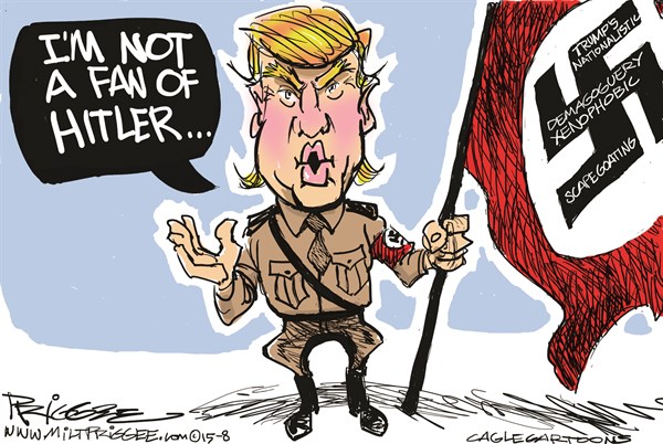صرح المرشح الرئاسي الأميركي دونالد ترامب بأنه غير معجب بهتلر، واستنكرت الصحف والمواقع الإخبارية هذا التصريح، ليس حبا في هتلر وإنما لأن أغلب تصريحات ترامب تؤكد أن شخصيته نازية