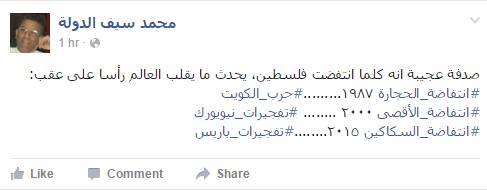 وقال سيف الدولة في منشور آخر: “صدفة عجيبة أنه كلما انتفضت فلسطين، يحدث ما يقلب العالم رأسًا على عقب: ‏#انتفاضة_الحجارة‬ ١٩٨٧………‏حرب_الكويت