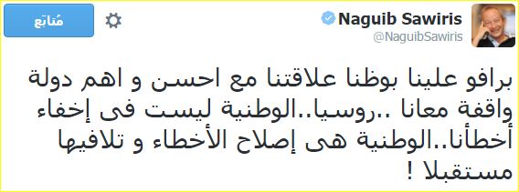 وقال ساويرس في تغريدة له عبر حسابه الشخصي على موقع التواصل الاجتماعي “تويتر”: “برافو علينا بوظنا علاقتنا مع أحسن وأهم دولة واقفة معانا.. روسيا.. الوطنية ليست في إخفاء أخطائنا.. الوطنية هي إصلاح الأخطاء وتلافيها مستقبلا!”.