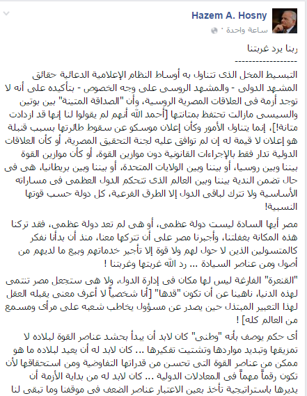 استنكر حازم حسني، إدارة السلطات المصرية لأزمة الطائرة الروسية، وتناول الأوساط الإعلامية للمشهد الدولي، والتأكيد أن العلاقات المصرية الروسية لازلت تحتفظ بمكانتها.