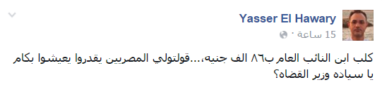 وقال الناشط السياسي ياسر الهواري، “كلب ابن النائب العام بـ٨٦ ألف جنيه… قولتولي المصريين يقدروا يعيشوا بكام يا سيادة وزير القضاة؟”.