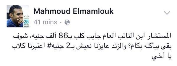 ومثله، قال محمد المملوك: “المستشار ابن النائب العام جايب كلب بـ86 ألف جنيه، شوف بقى بيأكله بكام؟ والزند عايزنا نعيش بـ2 جنيه، اعتبرنا كلاب يا أخي”.