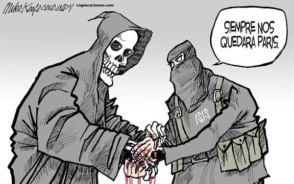رسم موقع “بولتيكال كارتونز” رسما صور خلاله تنظيم الدولة يعقد اتفاقا مع الموت ويصدر له الضحايا من أنحاء العالم