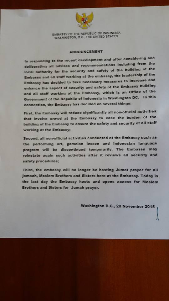 وأشار “يوسف” إلى أن السفارة أعلنت أن الصلاة مستمرة في المسجد الكبير والمركز الإسلامي الإندونيسي في منطقة سيلفر سبرينج في ميريلاند، وهي منطقة تقع في الدي سي مترو ايريا، إلا أنها ليست في الموقع المميز للسفارة الذي يساعد العشرات على الذهاب لأداء الصلاة.