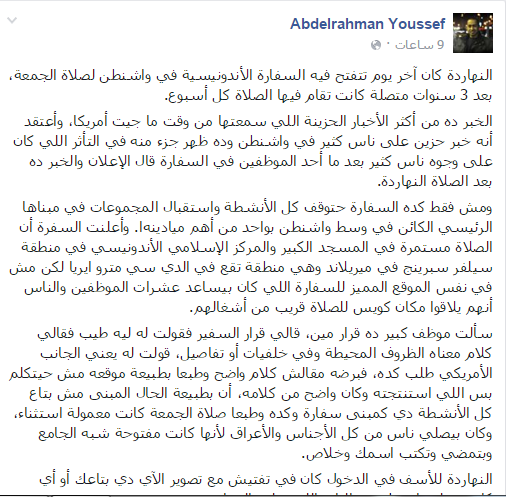 أعرب الكاتب الصحفي عبدالرحمن يوسف، عن أسفه؛ من إعلان السفارة الإندونيسية بأميركا عن غلق أبوابها أمام المصلين في صلاة الجمعة، بعد 3 سنوات متصلة كانت تقام فيها الصلاة كل أسبوع، مرجحًا أن تكون تلك الإجراءات تداعيات لموضوع فرنسا.