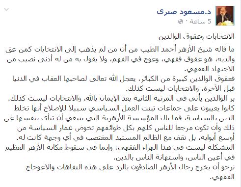 وصف الدكتور مسعود صبري، باحث بوزارة الأوقاف، تصريحات شيخ الأزهر، أحمد الطيب، أن من لم يذهب إلى الانتخابات كمن عق والديه، بأنه “عقوق فقهي”، وعوج في الفهم، ولا يقول به من له أدنى نصيب من الاجتهاد الفقهي.