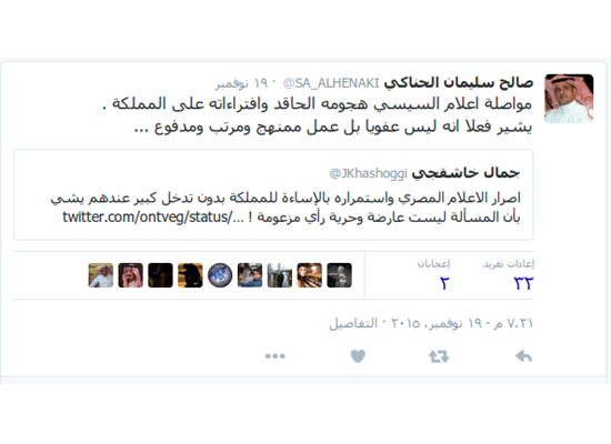 وبدوره عقب الكاتب السعودي صالح سليمان الحناكي على أقوال خاشقجي بتغريدة في السياق ذاته قائلاً: “مواصلة إعلام السيسي هجومه الحاقد وافتراءاته على المملكة، يشير فعلا إلى أنه ليس عفويا بل هو عمل ممنهج ومرتب ومدفوع”.