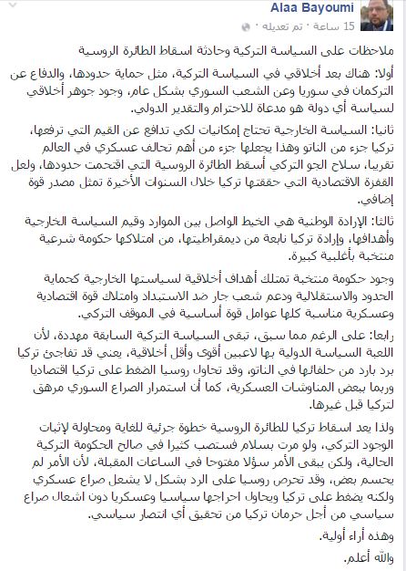 ودلل “بيومي” على توقعاته بـ4 ملاحظات على السياسة التركية، بعد أن أعلنت تركيا إسقاطها للطائرة الروسية.