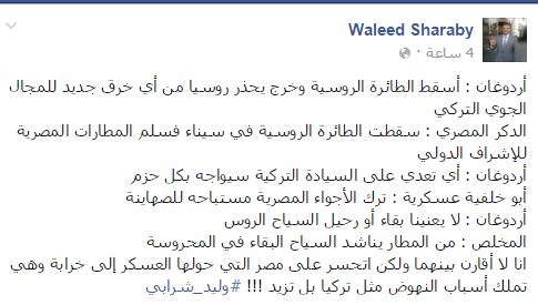 وقال شرابي عبر “فيس بوك”: “أردوغان أسقط الطائرة الروسية وخرج يحذر روسيا من أي خرق جديد للمجال الجوي التركي، الدكر المصري سقطت الطائرة الروسية في سيناء فسلم المطارات المصرية للإشراف الدولي”.