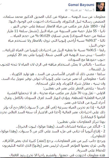 كتب السفير السابق، جمال بيومي، عشر معلومات موثقة عن سد النهضة، قال عنها “اجتهدت في الوصول إليها، نقلًا عن كتاب الدكتور محمد سلمان، المتضمن رسالته لنيل الدكتوراه”.