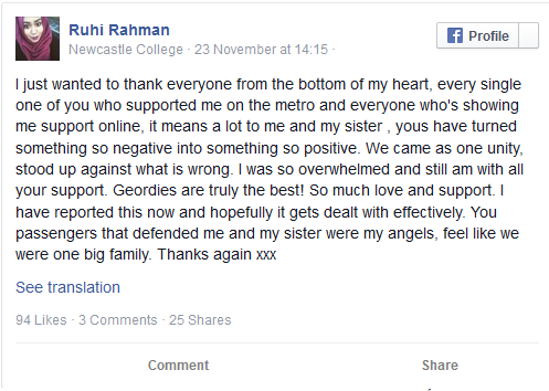 وفوجئت روحي رحمان البالغة من العمر 23 عامًا حين بدأ الرجل بمهاجمتها بكلام عدواني غير مبرر، حين جلست مع أختها في مترو مدينة نيوكاسل مساء السبت الماضي.