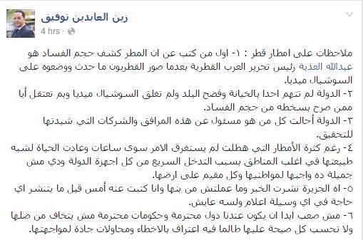 الإعلامي زين العابدين توفيق، المذيع بقناة “الجزيرة”، كتب عددًا من الملاحظات على الأمطار في قطر؛ حيث أوضح أن أول من كتب عن أن المطر كشف حجم الفساد هو عبدالله العذبة، رئيس تحرير “العرب” القطرية، بعدما صور القطريون ما حدث ووضعوه على السوشيال ميديا.