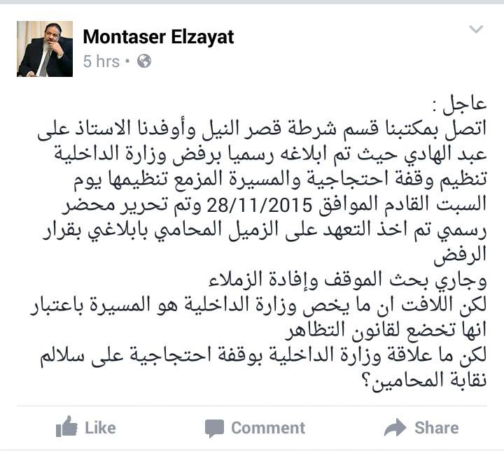 ونشر المرشح السابق لانتخابات نقابة المحامين “منتصر الزيات”، عبر حسابه الشخصي على موقع التواصل الاجتماعي فيس بوك تعليقا قال فيه: “عاجل: اتصل بمكتبنا قسم شرطة قصر النيل وأوفدنا الأستاذ علي عبد الهادي حيث تم إبلاغه رسميا برفض وزارة الداخلية تنظيم وقفة احتجاجية والمسيرة المزمع تنظيمها يوم السبت القادم الموافق 28/11/2015 وتم تحرير محضر رسمي تم أخذ التعهد على الزميل المحامي بإبلاغي بقرار الرفض، وجار بحث الموقف وإفادة الزملاء”.