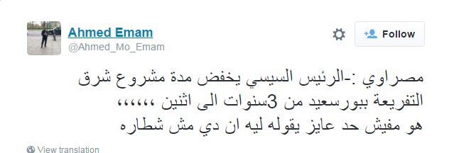 فيما علق Ahmed Emam على عنوان ذكرته “مصراوي”: الرئيس السيسي يخفض مدة مشروع شرق التفريعة ببورسعيد من 3 سنوات إلى اثنتين، قائلاً: “هو مفيش حد عايز يقوله ليه إن دي مش شطارة؟”.