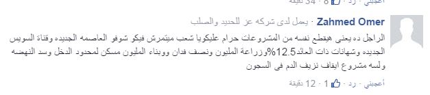 كما سخر Zahmed Omer “الراجل ده ياعيني هيقطع نفسه من المشروعات، حرام عليكو يا شعب ميتمرش فيكو، شوفو العاصمة الجديدة وقناة السويس الجديدة وشهادات العائد12.5%وزراعة المليون ونصف فدان، ووبناء المليون مسكن لمحدودي الدخل وسد النهضة، ولسه مشروع ايقاف نزيف الدم في السجون..jpeg)